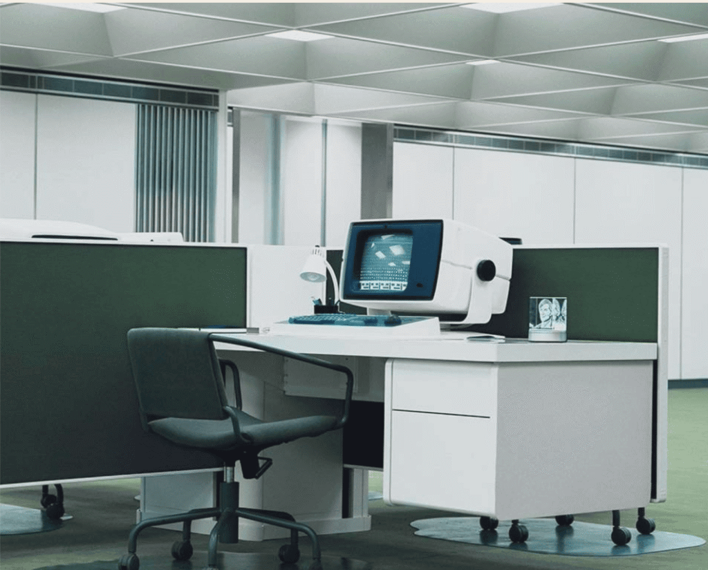 A quiet, old-school cubicle setup—an image of office life before today’s hybrid work norms.